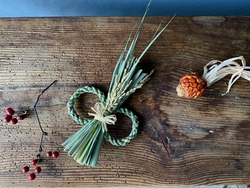 真菰を縄綯いし、稲穂を束ねましたお正月飾りになります。